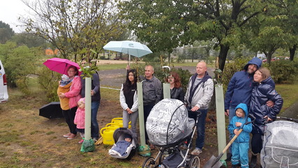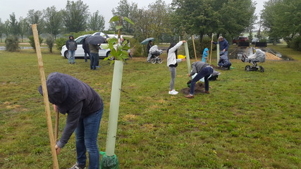 Der Bürgermeister, Harald Groba, und der Vorstandsvorsitzende, Ralf Kirsch, (v.l.n.r.) sprechen zu den Zuwendungsempfängern. Die erste Pflanzung in Neuendorf.