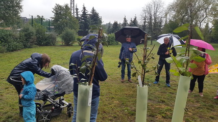 Der Bürgermeister, Harald Groba, und der Vorstandsvorsitzende, Ralf Kirsch, (v.l.n.r.) sprechen zu den Zuwendungsempfängern. Die erste Pflanzung in Neuendorf.